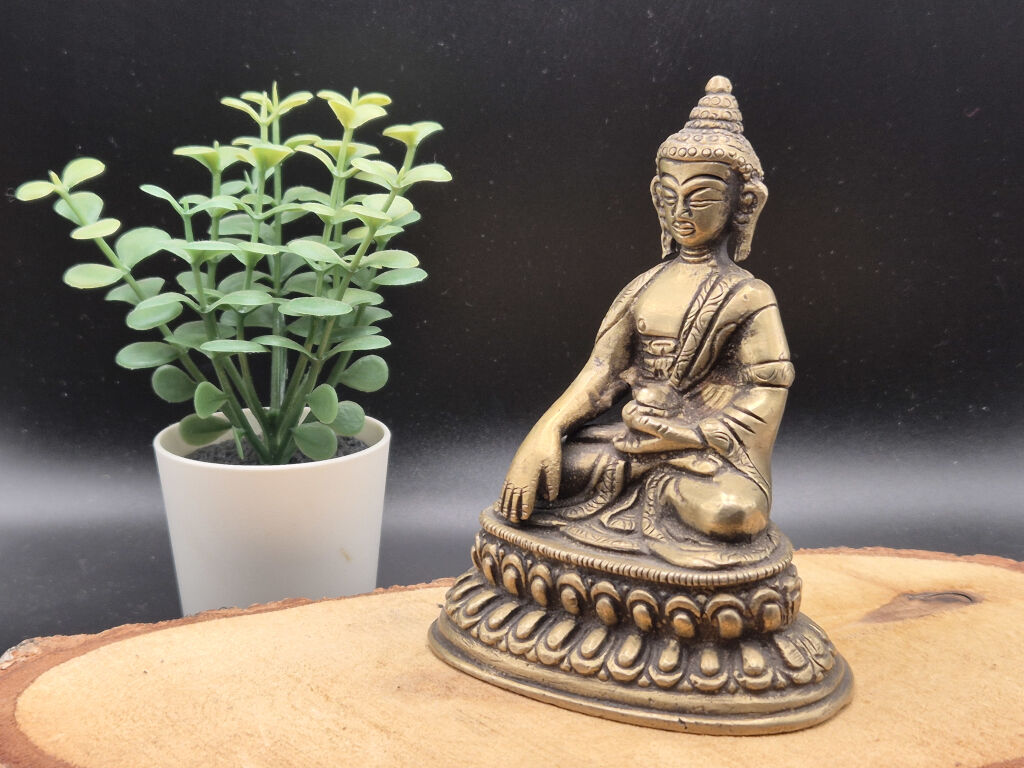 Dieser erdende Buddha aus Messing zeigt den historischen Buddha im Moment innerer Standhaftigkeit und geistiger Klarheit. Mit einer Höhe von etwa 11 cm und einem Gewicht von rund 300 g wirkt die Figur präsent und stabil.