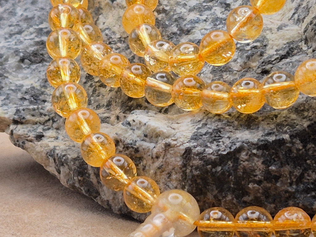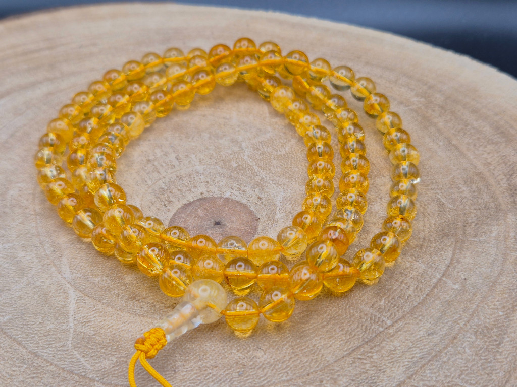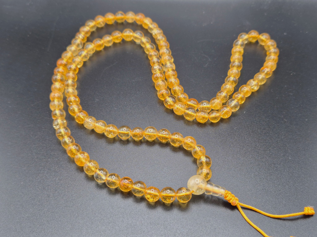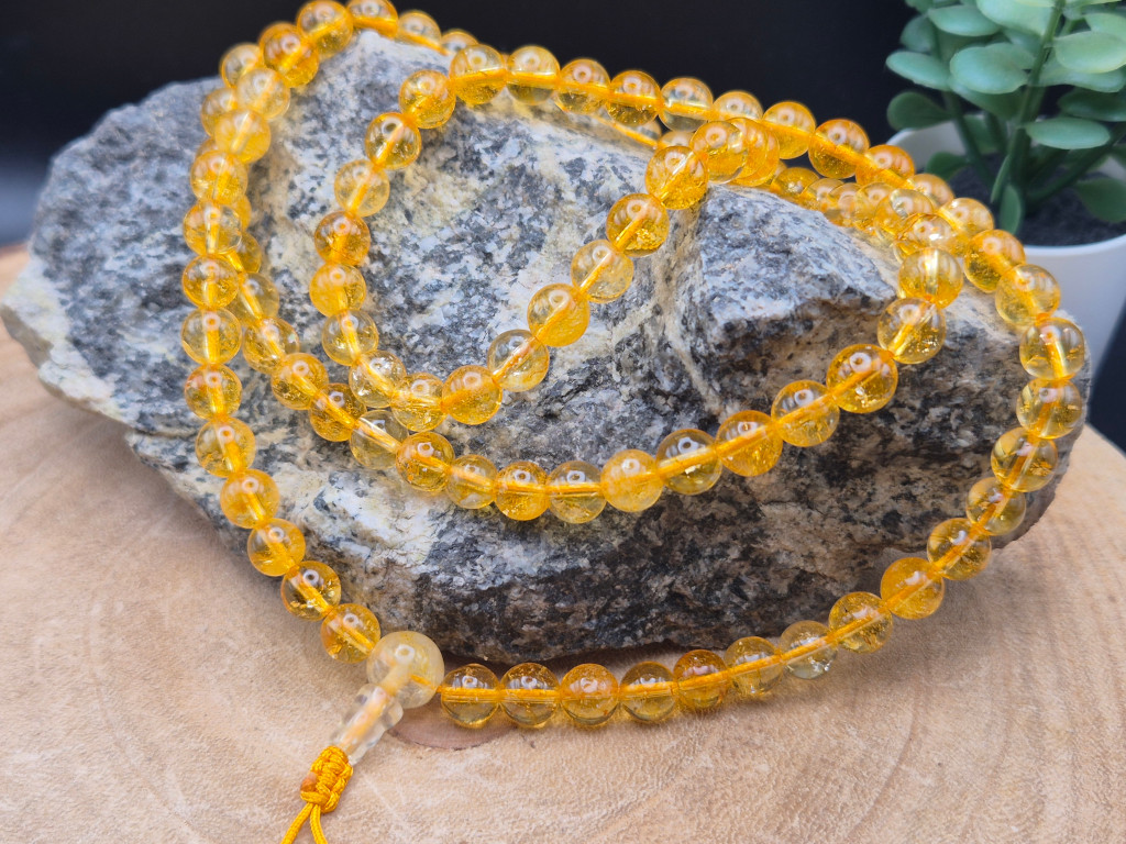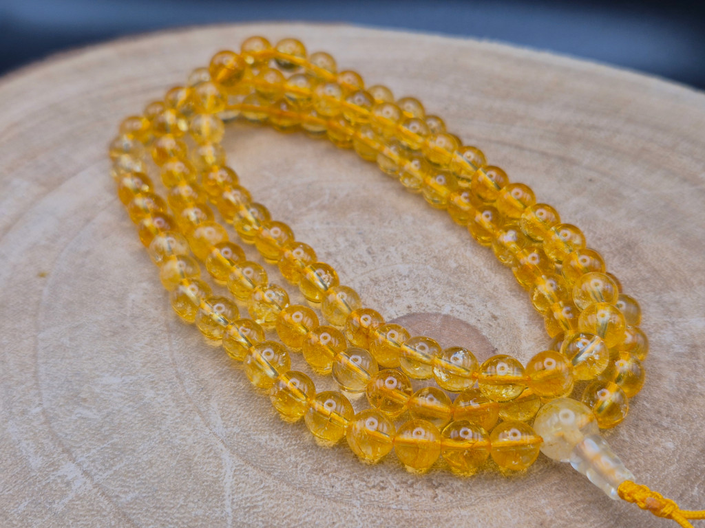 Diese Mala-Kette aus gelbem Quarz fällt sofort durch ihre warme, leuchtende Farbe auf. Die gleichmäßig gearbeiteten Perlen wirken klar und ruhig – fast wie kleine Lichtpunkte, die sich zu einer harmonischen Kette verbinden.