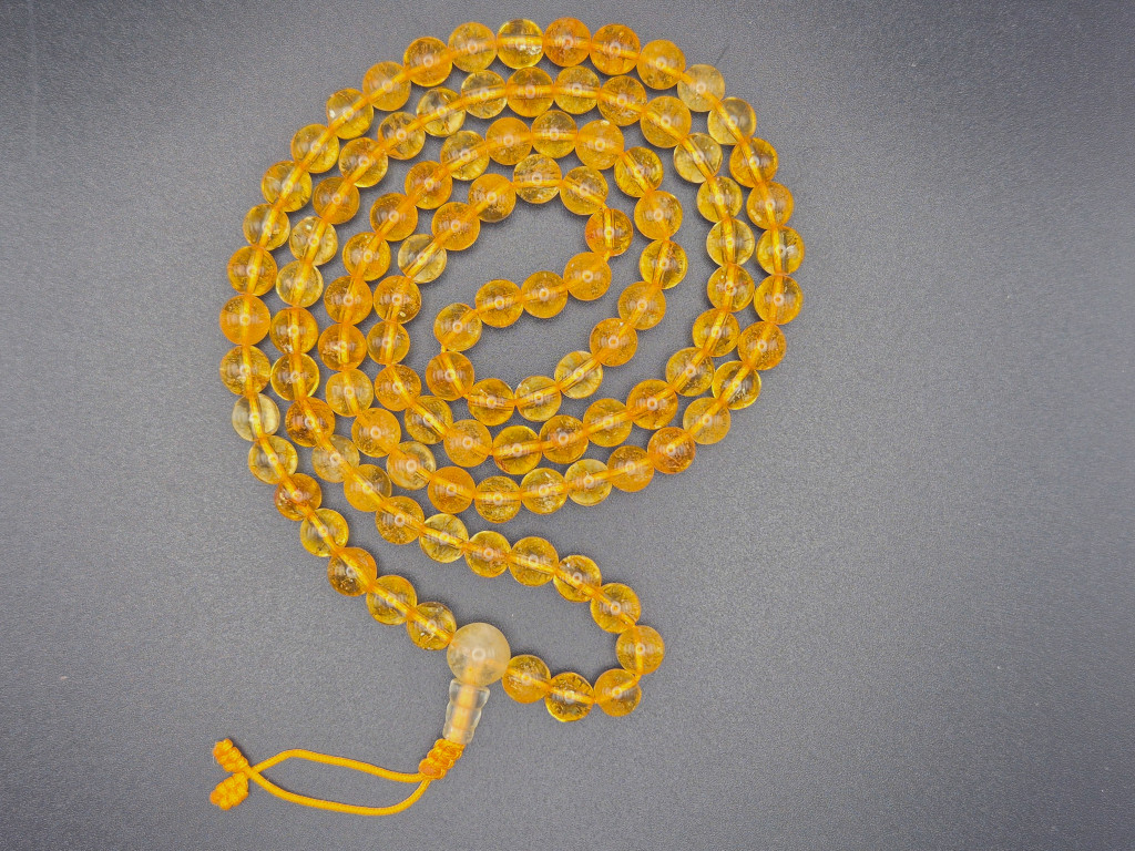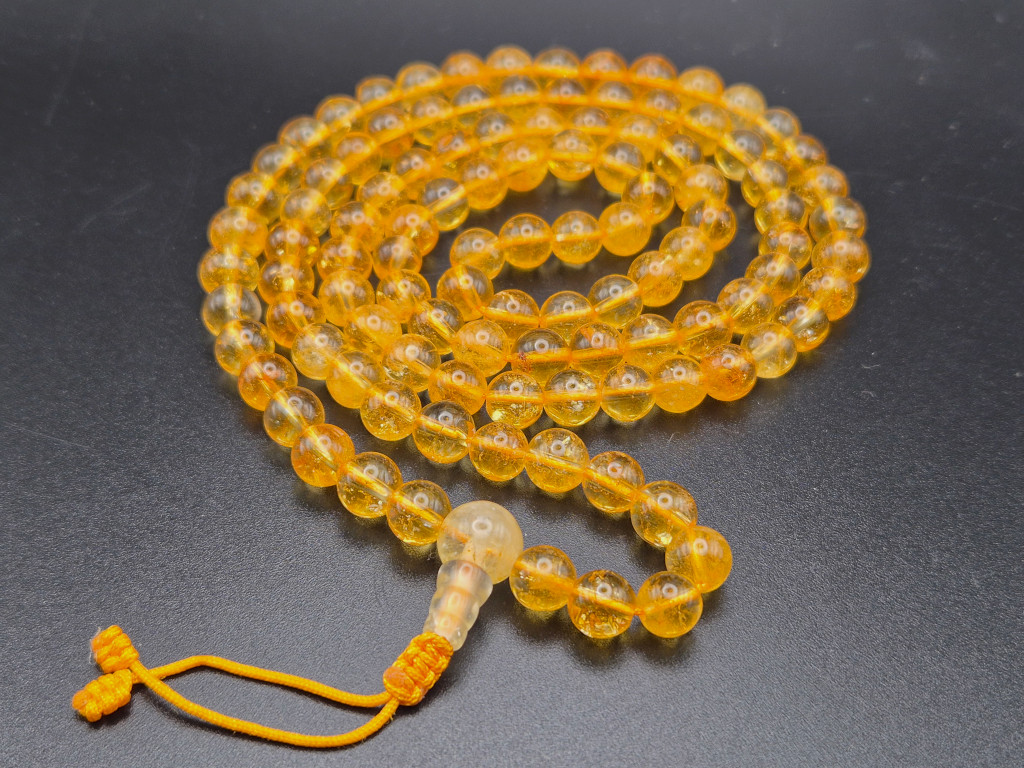 In Nepal wird diese Art von Mala häufig als „Citrin“ bezeichnet. Tatsächlich handelt es sich jedoch um Quarz in einem warmen Gelbton. Ich gebe diese Bezeichnung bewusst transparent weiter.