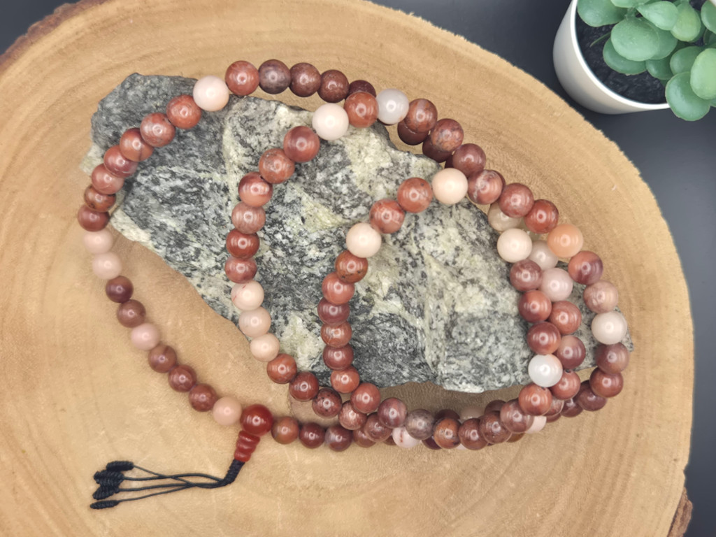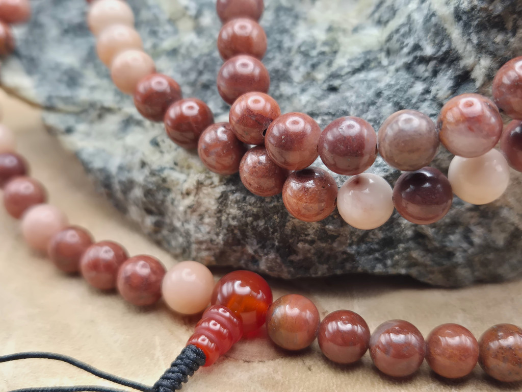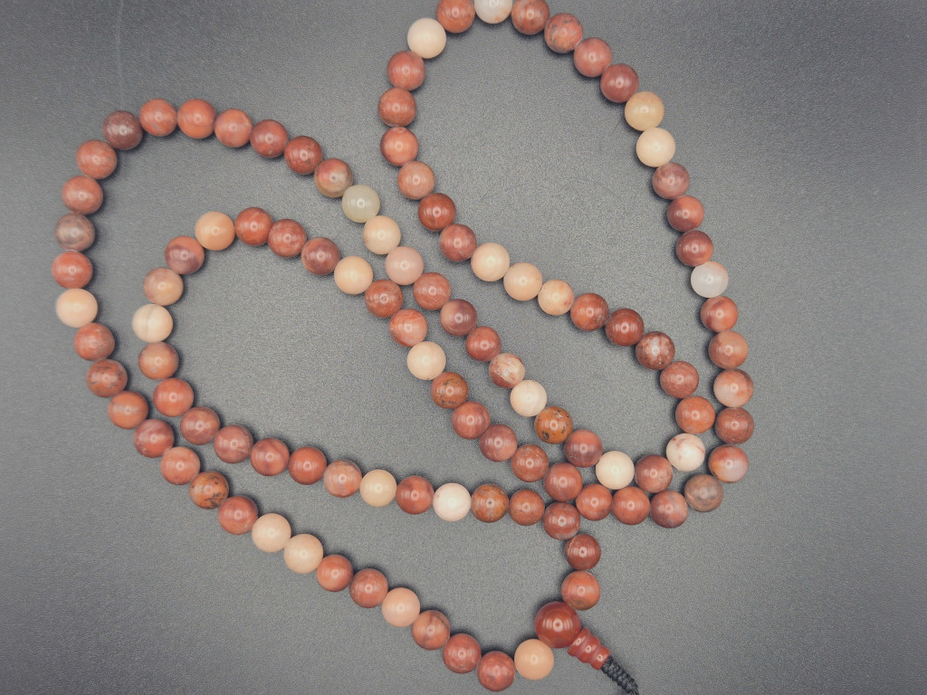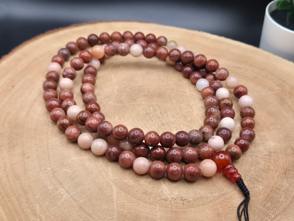 Die Jaspis Mala-Kette in warmen Erdtönen verbindet verschiedene Nuancen von Rot, Braun und Beige zu einem ruhigen, natürlichen Gesamtbild. Die einzelnen Perlen zeigen eine lebendige, mineralische Struktur mit feinen Einschlüssen und sanften Farbverläufen – von tiefem Rostrot bis hin zu hellen, fast sandfarbenen Tönen.