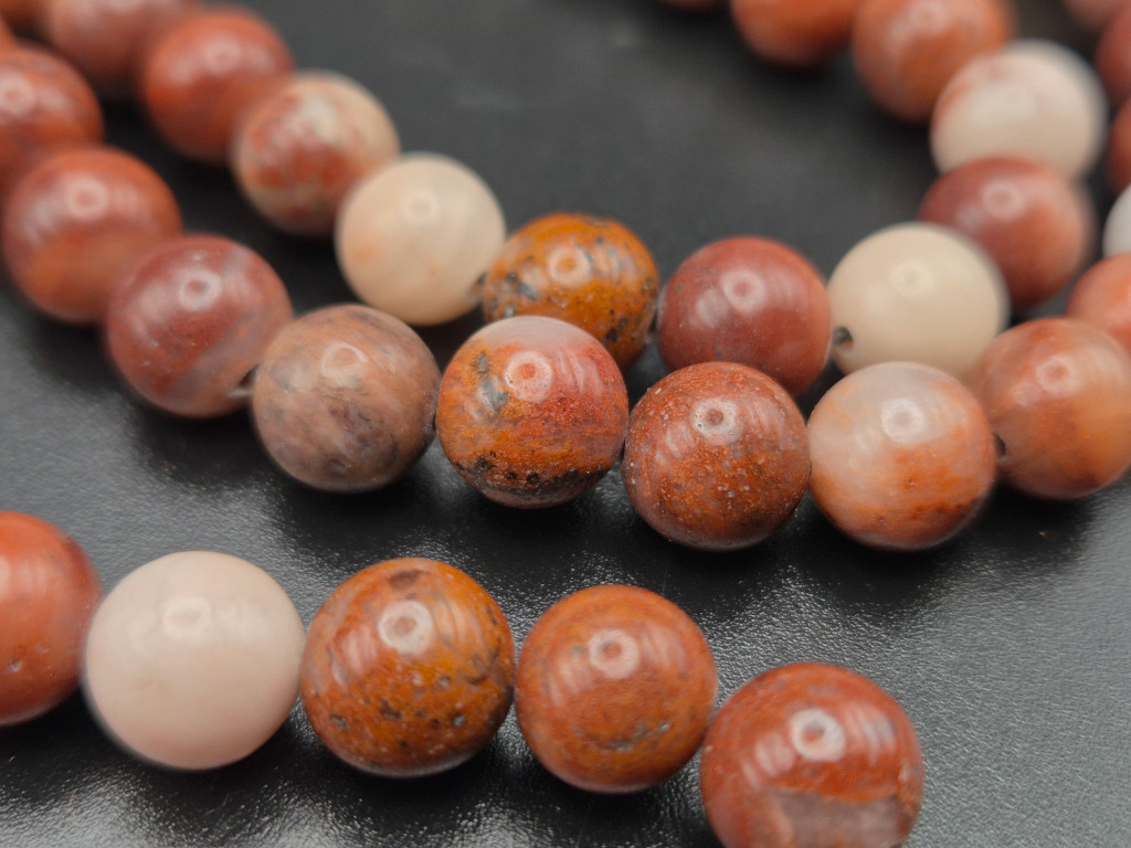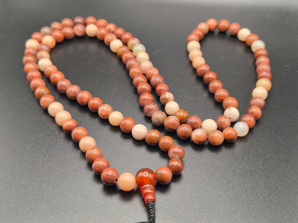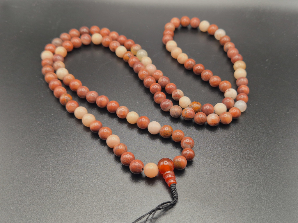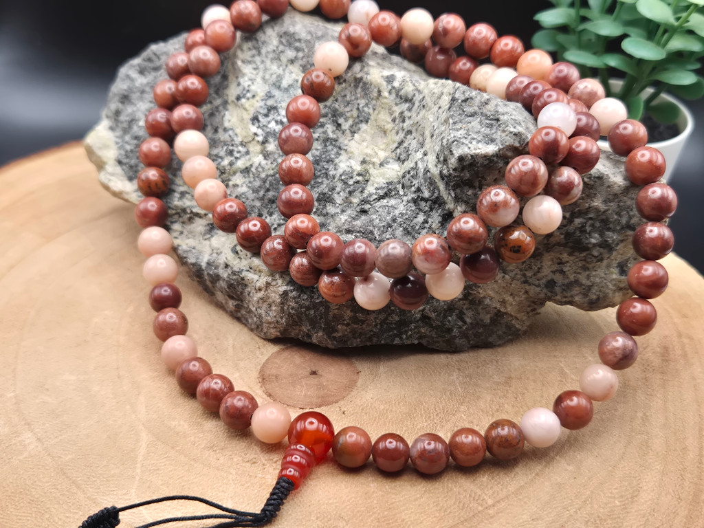 Die Jaspis Mala-Kette in warmen Erdtönen verbindet verschiedene Nuancen von Rot, Braun und Beige zu einem ruhigen, natürlichen Gesamtbild. Die einzelnen Perlen zeigen eine lebendige, mineralische Struktur mit feinen Einschlüssen und sanften Farbverläufen – von tiefem Rostrot bis hin zu hellen, fast sandfarbenen Tönen.