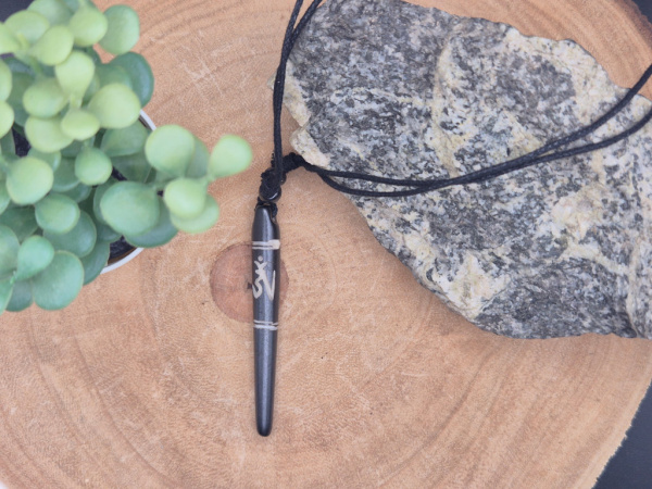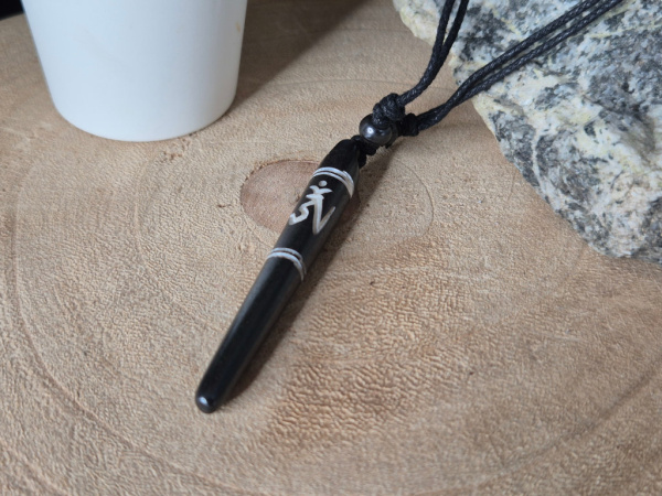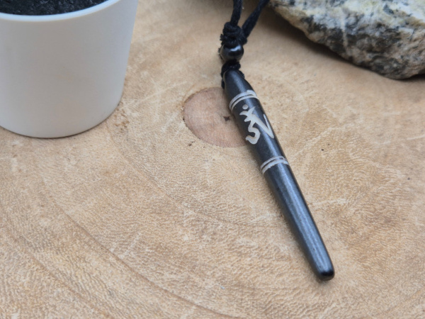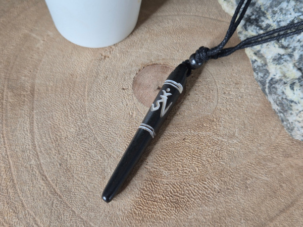 Der längliche, polierte Anhänger ist aus dem Knochen von Wasserbüffeln gefertigt – einem Nebenprodukt der traditionellen nepalesischen Landwirtschaft. Durch die natürliche Maserung und das von Hand eingeritzte Sanskrit-Symbol entsteht ein Schmuckstück mit .