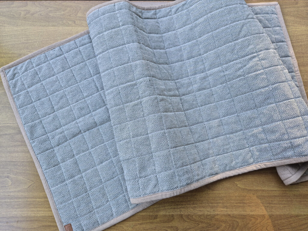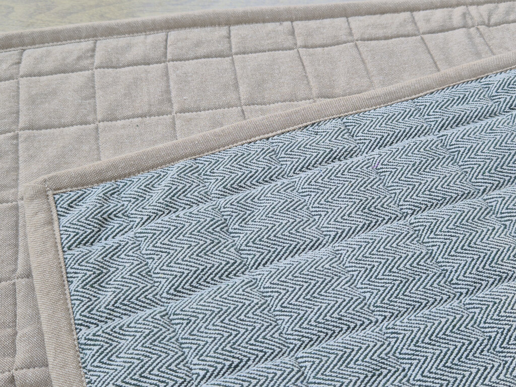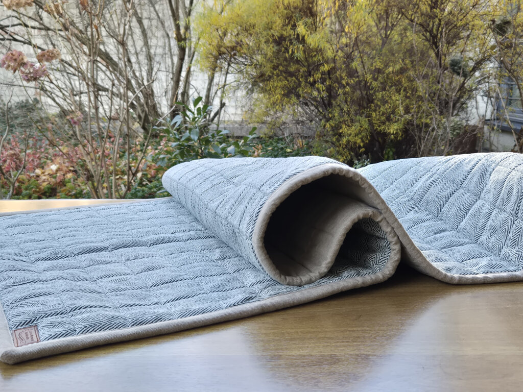 Das Material fühlt sich weich unter den Händen und Füßen an und sorgt für ein warmes, leicht massierendes Gefühl beim Stehen, Knien oder Sitzen. Durch das dichte Webmuster entsteht ein griffiger, stabiler Halt, ohne die matte Ruhe des Stoffes zu verlieren. Jede Matte wird in sorgfältiger Handarbeit gefertigt und ist ein Einzelstück – kleine Abweichungen im Webbild gehören dazu und sind typische Merkmale der traditionellen Herstellung.