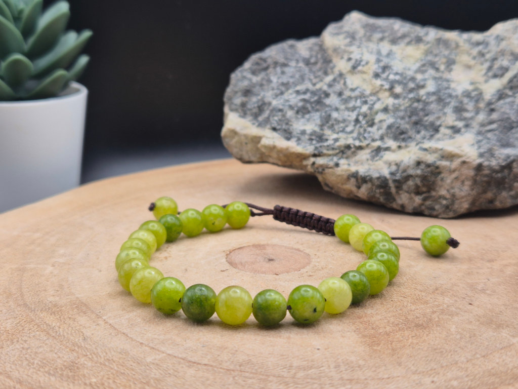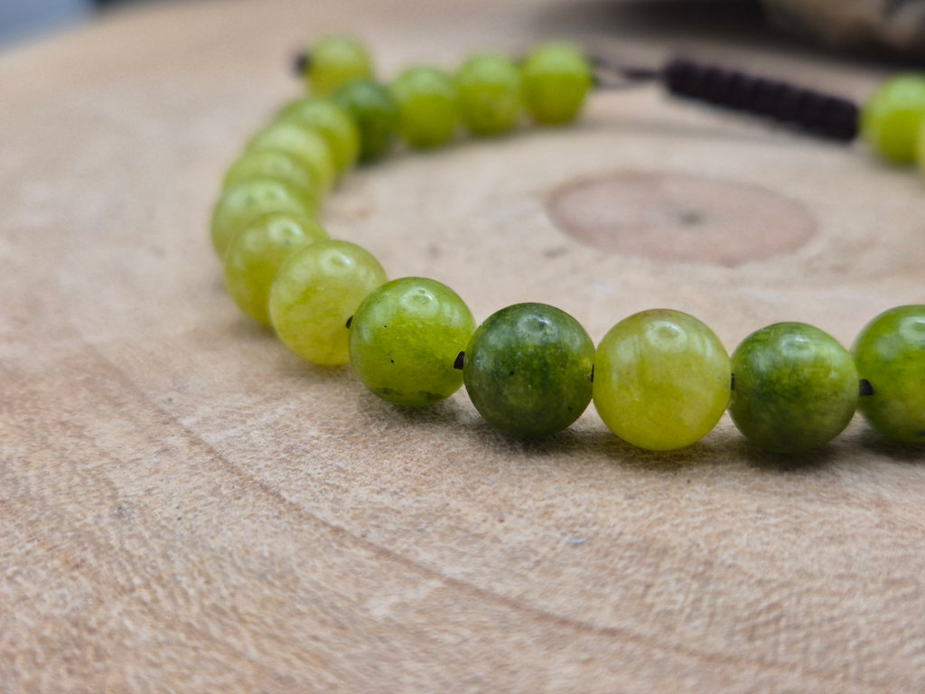 Das Armband aus Serpentin-Jade vereint sanfte Grüntöne mit einer glatten, angenehm kühlen Oberfläche. Jede Perle wird einzeln geschliffen und in Handarbeit auf ein verstellbares Band aufgefädelt. So entsteht ein harmonisches Schmuckstück, das Leichtigkeit und Erdverbundenheit zugleich ausstrahlt.