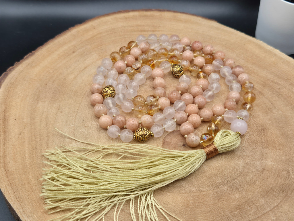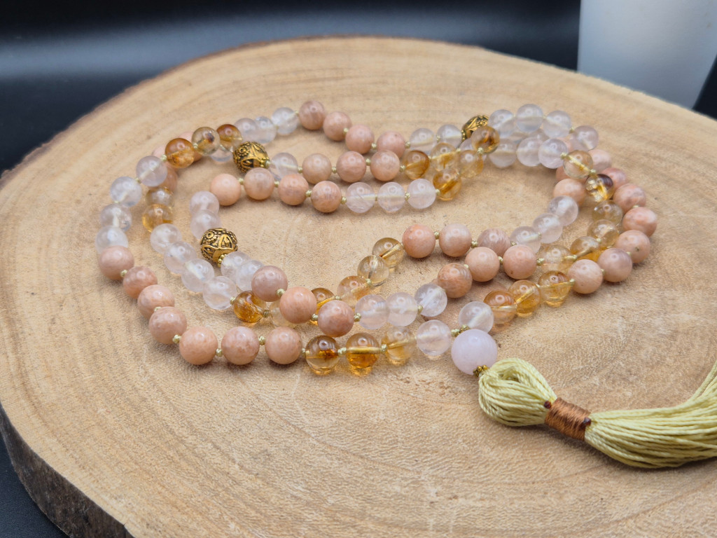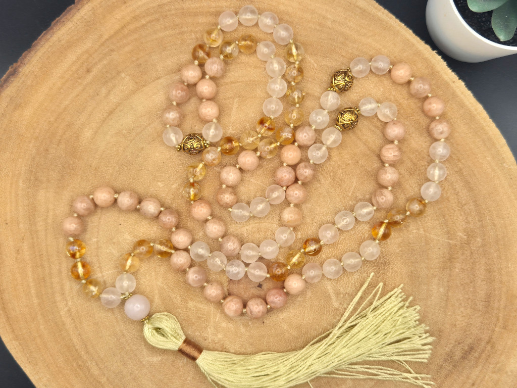 Die "Mala der inneren Harmonie" vereint drei Edelsteine, die traditionell mit Wärme, Ausgleich und innerer Ruhe in Verbindung gebracht werden: Citrin, Pfirsich-Mondstein und Rosenquarz. Die weichen Farbnuancen aus Creme, Apricot, Rosé und zarten Goldtönen verleihen der Mala eine besonders ruhige, freundliche Ausstrahlung.