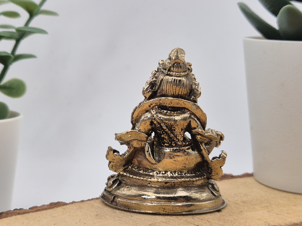 Der Kubera (Jambhala) aus Messing ist eine fein gearbeitete Mini-Statue mit einer Höhe von etwa 5,3 cm. Er gehört zu einer neuen Serie kleiner, detailreicher Mini-Statuen aus Nepal. Diese ersetzt die besonders feinen Mini-Statuen früherer Jahre, die heute kaum noch erhältlich sind – und bietet dennoch eine schöne, authentische Alternative für alle, die dezente Figuren bevorzugen.