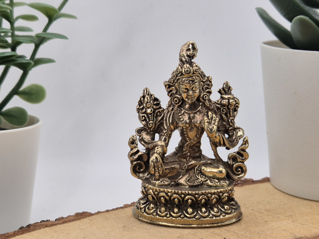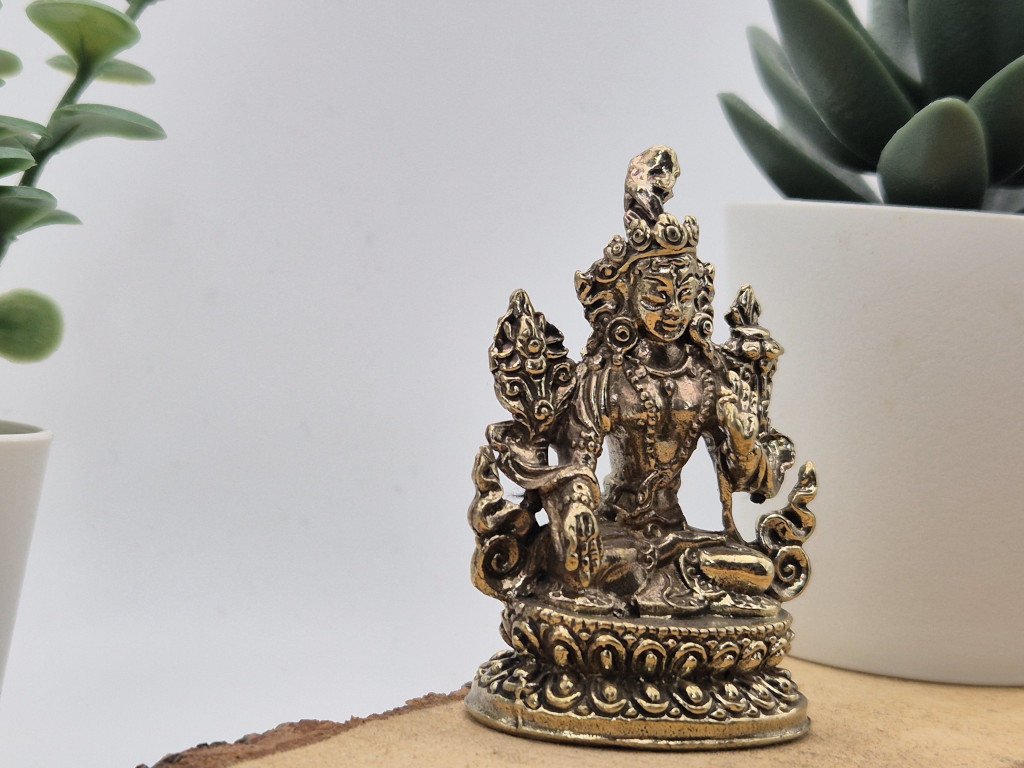 Die Weiße Tara (Sitatara) aus Messing ist eine fein gearbeitete Mini-Statue mit einer Höhe von etwa 5,8 cm. Sie gehört zu einer neuen Serie kleiner, detailreicher Mini-Statuen aus Nepal. Diese ersetzt die besonders feinen Mini-Statuen früherer Jahre, die heute kaum noch erhältlich sind – und bietet dennoch eine schöne, authentische Alternative für alle, die dezente Figuren bevorzugen.