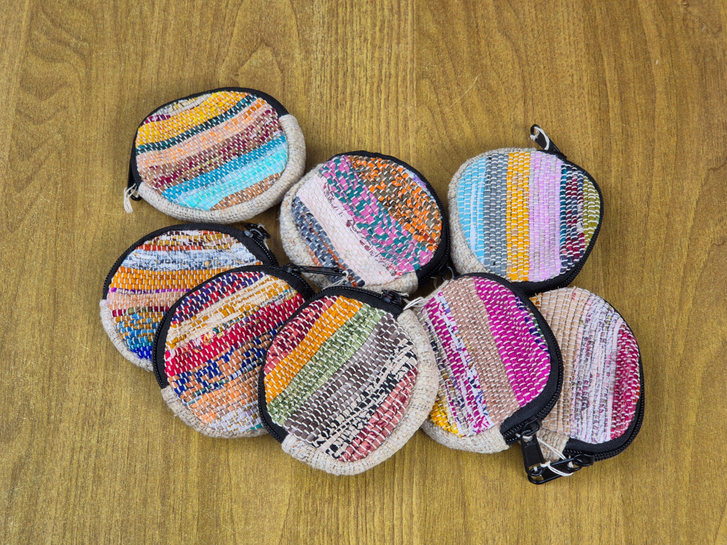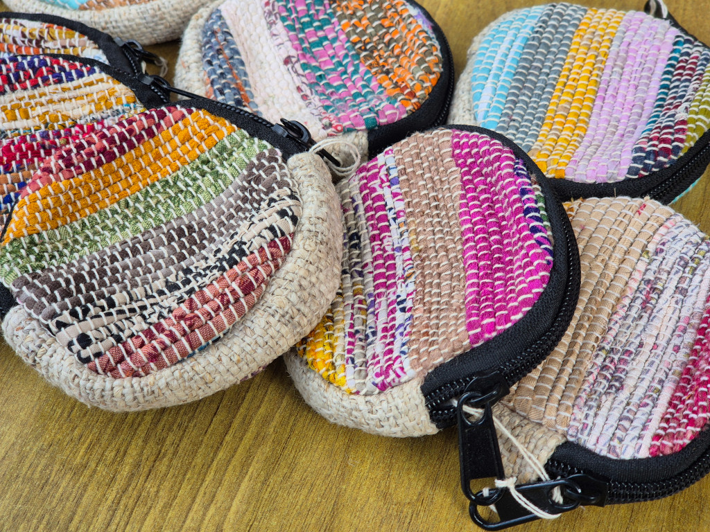 Die bunten Stoffflächen stammen aus wiederverwendeten Saris. Dadurch ist jeder Münzbeutel ein echtes Einzelstück – nicht nur leicht unterschiedlich, sondern wirklich einzigartig. Dass ein Muster später noch einmal exakt so entsteht, ist praktisch ausgeschlossen. Der Hanfrand gibt dem Münzbeutel Form und Robustheit, der Reißverschluss hält Münzen, Scheine oder Kleinigkeiten sicher zusammen.