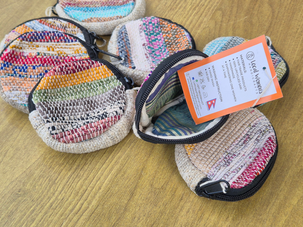 Dieser kleine runde Münzbeutel verbindet zwei Materialien, die in Nepal eine ganz eigene Geschichte erzählen: recycelte Sari-Stoffe im farbigen Muster und Hanfgewebe als stabiler Rand. Gefertigt wird jedes Stück von Local Women’s Handicraft (LWH) in Kathmandu – einer Frauenorganisation, die faire Arbeit, Schulungen und ein eigenständiges Einkommen ermöglicht.