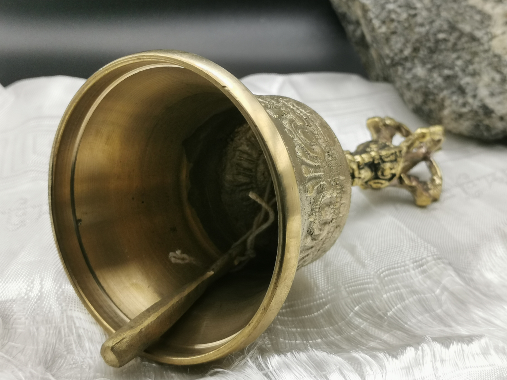 Die tibetische Glocke bzw. "Ghanti" ist die für buddhistische Rituale verwendete Glocke, die in der linken Hand gehalten wird. Sie steht für das Weibliche und symbolisiert Weisheit. In der rechten Hand wird der Blitz und Donner ("Vajra") gehalten. Das "Vajra" soll die Ignoranz bewältigen und symbolisiert das Männliche. In buddhistischen RItualen werden die beiden Gegenstände immer gemeinsam genutzt.